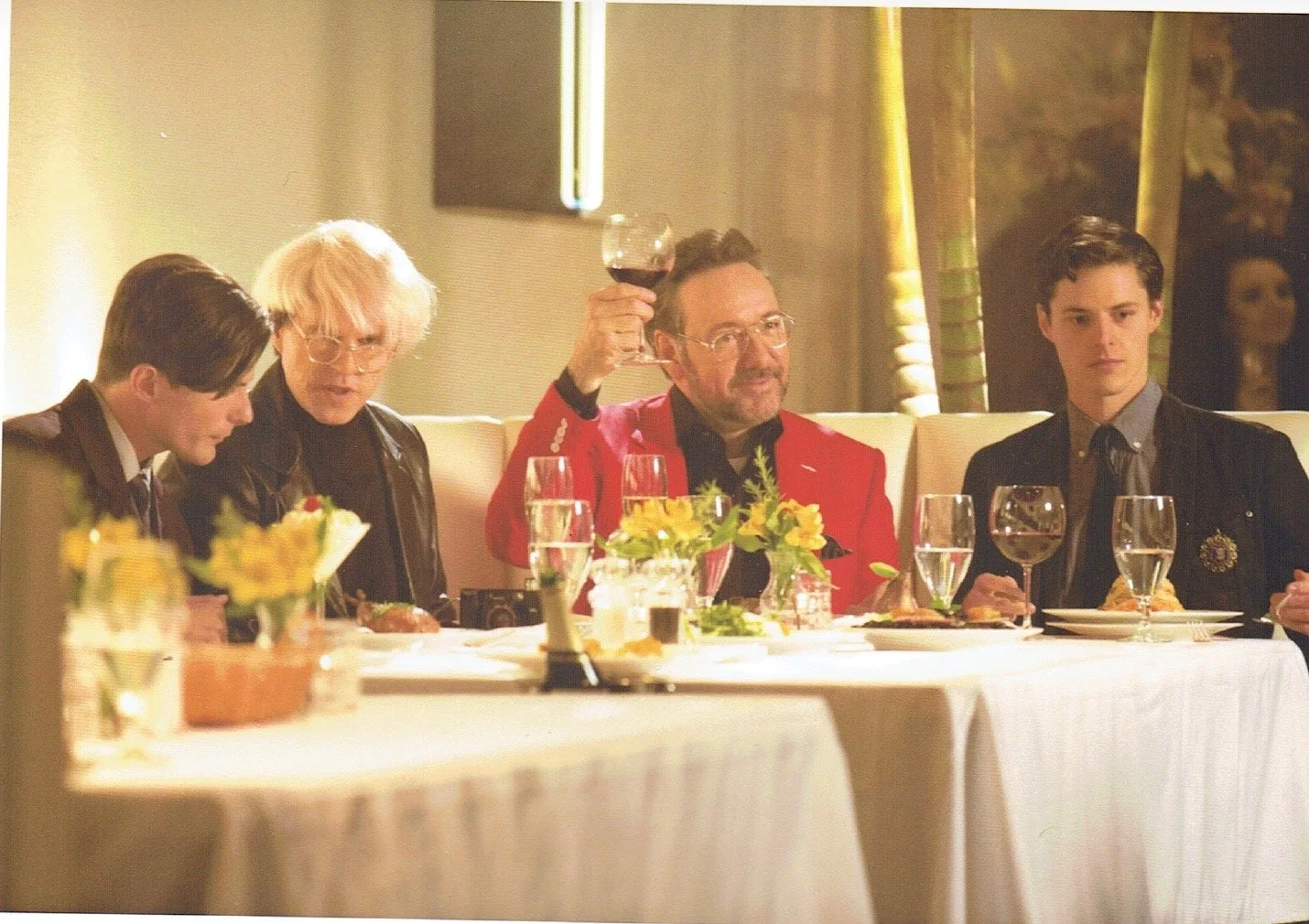 Ansel Elgort: broke scholarship kid turned killer CEO. Taron Egerton: the best friend. Emma Roberts. Kevin Spacey. And full circle—Cary Elwes as Andy Warhol, with a pitch-perfect wig.